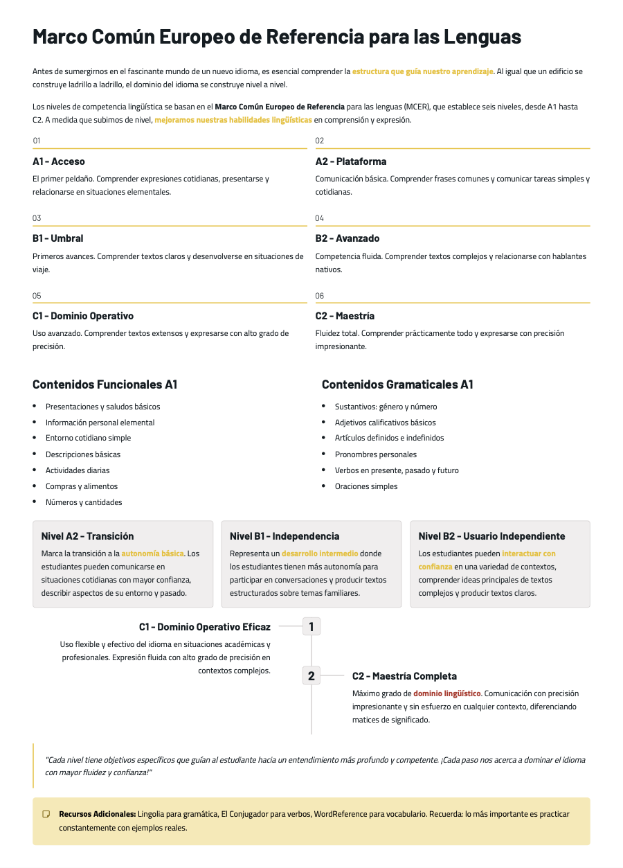 Los niveles de competencia lingüística se basan en el Marco Común Europeo de Referencia para las lenguas (MCER), que establece seis niveles, desde A1 hasta C2. A medida que subimos de nivel, mejoramos nuestras habilidades lingüísticas en comprensión y expresión. ¡Cada paso nos acerca a dominar el idioma con mayor fluidez y confianza! 🌱